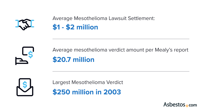 The average mesothelioma lawsuit settlement ranges from $1 million to $2 million. The average trial verdict ranges between $5 million to $20.7 million, according to latest Mealey’s Litigation Reports. Mesothelioma settlements and verdicts may help patients and their families cover medical costs, lost income and additional expenses.